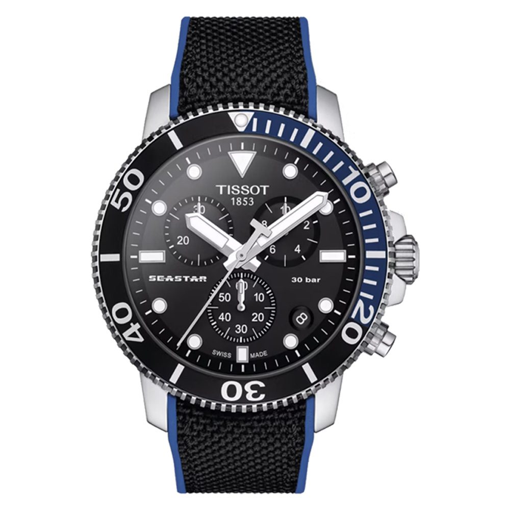 The ultimate sophistication in diving equipment, both aesthetically and technically, the Tissot Seastar 1000 Chronograph embodies style and performance without compromise. Perfectly reliable up to a pressure of 30 bar (300m), it is proof that an underwater sports watch and a chronograph can be reconciled in one object. The diving theme is omnipresent with elements such as a unidirectional aluminum bezel, luminescent hands and indexes. Finally, the Tissot Seastar 1000 collection offers a multitude of choices of compatible straps.